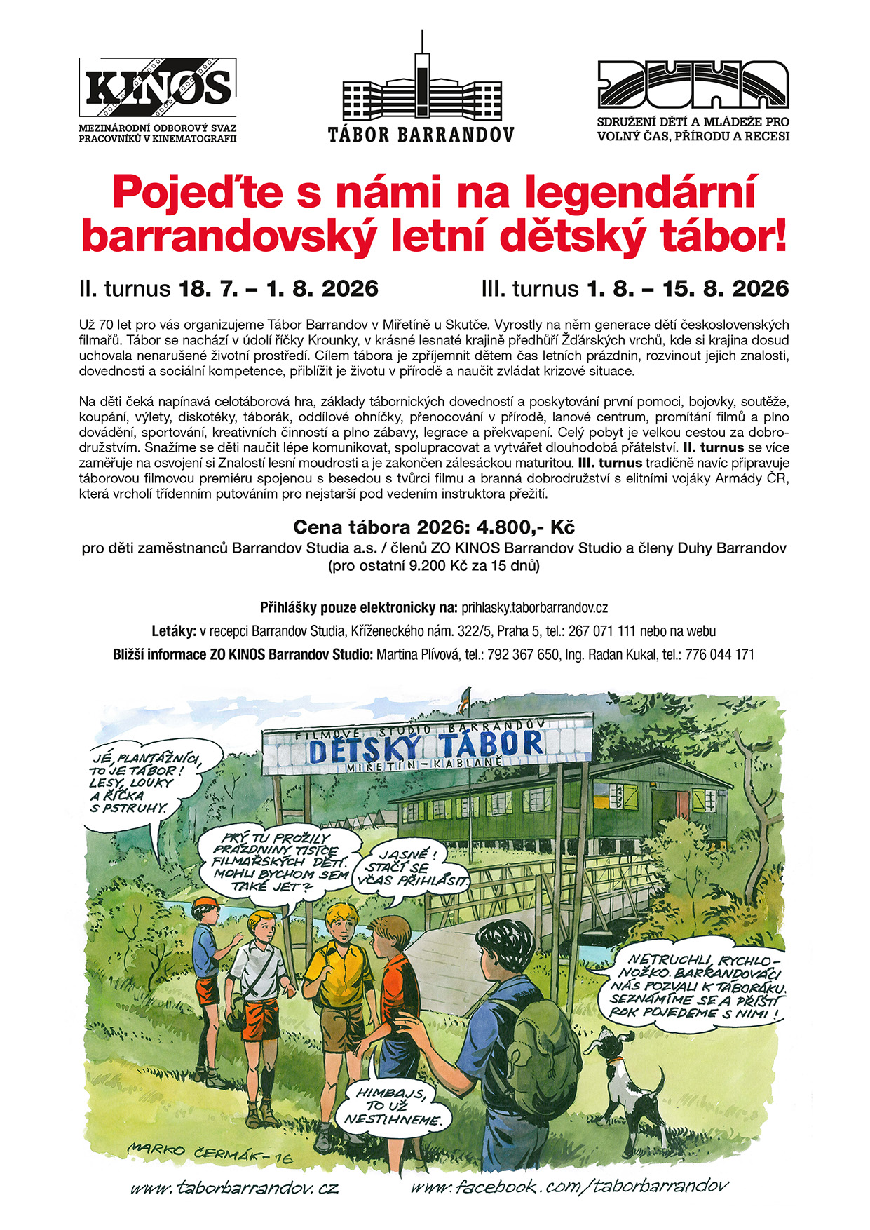 Přihlašování probíhá elektronicky. Pokud se chcete přihlásit na Tábor Barrandov, tak klikněte na odkaz prihlasky.taborbarrandov.cz a vyplňte údaje o svých dětech. Vytištěné letáky jsou k dispozici v recepci Barrandov Studia a.s. V rubrice „Ke stažení“ najdete leták a plakát Tábora Barrandov a další informace o táboře. Leták si můžete vytisknout a podarovat jím kamarády, se kterými byste chtěli jet v létě na tábor společně. Rozhodně s přihlašováním svých dětí a jejich kamarádů neotálejte. O tábor je velký zájem. Bude-li organizátorovi orgány státní správyv létě zakázáno pořádat tábory z důvodu pandemie COVID-19, budou vám vráceny uhrazené platby ve výši 100 %, tj. bez stornopoplatků! Nemusíte se tedy bát, že byste o ně přišli. Tábor Barrandov realizujeme s podporou Ministerstva školství, mládeže a tělovýchovy ČR, Pardubického kraje, Hlavního města Prahy, Státního fondu životního prostředí a města Proseč.